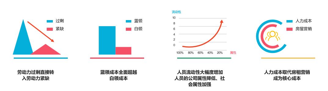 中国服务业面临四大难题:第一,用工市场已经从劳动力过剩逆转为紧缺状态;第二,蓝领成本即将超过白领成本。由于蓝领的离职率和周转率相当高,导致其综合招聘成本和管理成本也远远超过一般的白领;第三,服务行业的人员流动性大幅度增加,这说明员工的公司属性在降低,社会属性在加强;第四,我们发现人力成本已经逐渐取代企业的生产资料成本,比如房租、 原材料、机器,成为企业上升最快也是最核心的成本。