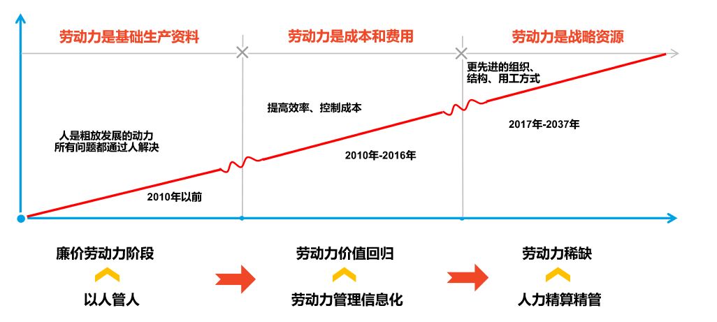 我们尝试将人力资源管理的发展划分为三个阶段,第一阶段是在2010年之前,人代表基础的生产资料,是企业粗放发展的动力,所有问题都可以通过人解决,所以这个阶段的管理方式就是“以人管人”;第二阶段是在2010-2016年之间,劳动力价值在回归,这个阶段人力成本开始慢慢增加,需要由信息系统来提高人力资源部门的工作效率;2017年是第三个阶段的起点,中国开始进入人力精算阶段,人作为企业的战略资源,必须要通过精细化管理的方式,降低人力成本,从而真正提高企业竞争力。
